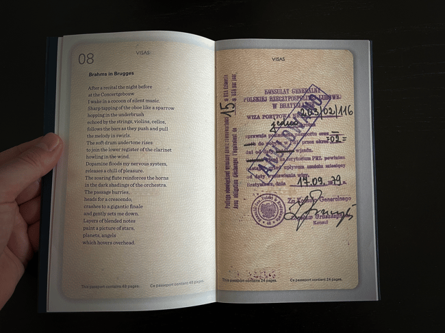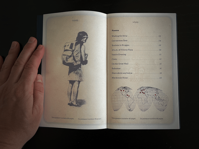 You’ll see some pages from my first chapbook, There and Here published in January 2021. It’s writings about some of my travels. Although they’re my experiences I hope you can imagine them or find something that resonates with your experiences. Both my parents were immigrants to Canada, so I think I always expected to travel to their homes in the UK. Growing up in an isolated mining town exposed me to people from many parts of the globe. Dad’s siblings immigrated to Australia and USA. My first passport took me to New Zealand in 1967. I’ve kept all my passports since (maybe I had to give up one) and when I was thinking of how to present them, the passport idea came up. Dandy Co. did the design and binding and I’m thrilled with how it looks. Thanks Dan.